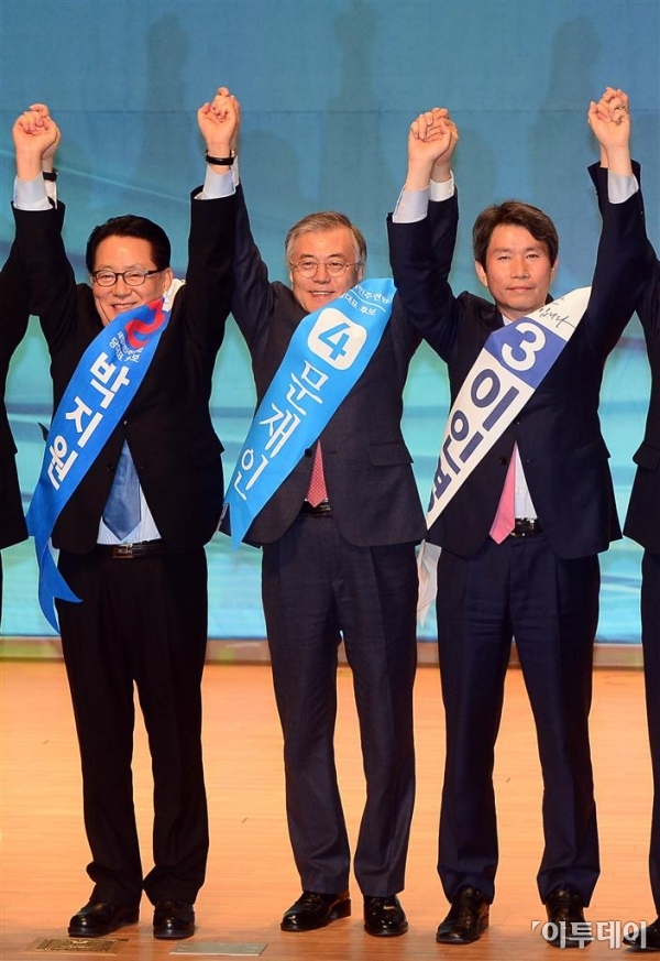 새정치민주연합 당대표 및 최고위원 선출을 위한 예비경선이 7일 오후 여의도 국회 의원회관 대회의실에서 열렸다. 투표 결과 당대표 후보로 선출된 박지원, 문재인, 이인영 후보가 무대에 올라 지지자들에게 손을 들어 인사하고 있다. 노진환 기자 myfixer@