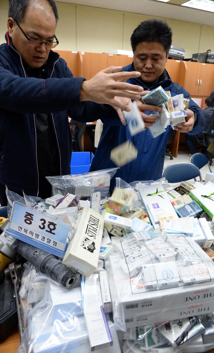 전북 익산경찰서는 12일 슈퍼와 철물점 등에서 담배를 훔친 혐의(절도)로 박모(59)씨 등 2명을 구속했다. 이날 담배 절도범 검거 브리핑이 열린 전북지방경찰청에서 경찰이 압수한 담배와 증거물품을 정리하고 있다. 이들은 지난 7일 오후 11시40분께 익산시 한 철물점에서 담배 110보루(1100갑)와 누수탐지기 등 건축공구(시가 900만원 상당)를 훔쳐 달아났다. 이들은 또 다음날 비슷한 시각 전주의 한 편의점에 들어가 담배 500여갑과 음료수(시가 300만원 상당)를 훔쳤다.