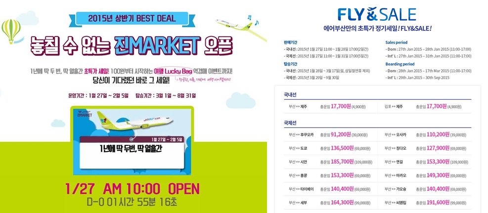 저비용항공사(LCC)인 진에어와 에어부산의 항공가 특가 세일 이벤트가 온라인 상에서 화제다. 특히 두 항공사가 파격적인 가격에 항공권 할인 이벤트를 내놓으면서 이들 항공사의 이벤트 항공 티켓을 비교 구매하려는 네티즌들의 움직임이 분주하다.