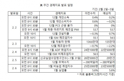 2일에는 작년 12월 개인소득 및 개인소비지수가 발표한다. 개인소득은 기존 0.4%에서 0.2%로 하락할 것으로, 개인소비지수는 0.6%에서 마이너스(-) 0.2%로 하락전환할 것으로 시장은 전망하고 있다.