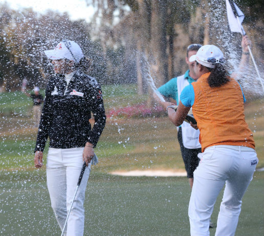 ▲LPGA투어 시즌 개막전 코츠골프 챔피언십에서 우승한 최나연이 동료 선수들로부터 우승 축하 샴페인 세례를 받고 있다. (AP연합)