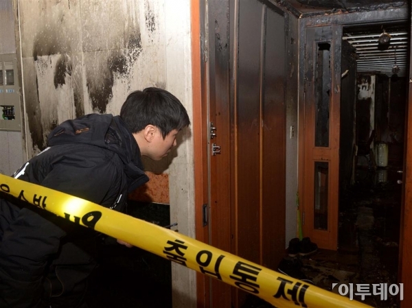 서울 방배동 래미안아파트 1층에서 3일 낮 12시 56분 경 화재가 발생해 15분 만에 진화됐다. 이 불로 1층에 사는 여성 한 명이 연기를 마셔 인근 병원으로 옮겨졌으나 다른 인명피해는 없는 것으로 알려졌다. 서울소방 화재조사팀 직원이 조사를 위해 현장으로 들어가고 있다. 신태현 기자 holjjak@