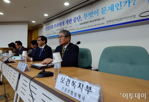 새정치민주연합 정책위원가 주최한 긴급토론회 ‘건강보험 부과체계 개편중단, 무엇이 문제인가?’가 5일 오전 여의도 국회 의원회관 소회의실에서 열린 가운데 보건복지부 건강보험정책국에서 토론회에 불참해 자리가 비어있다. 노진환 기자 myfixer@