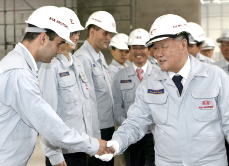 정몽구 현대ㆍ기아차 회장(오른쪽)이 16일 슬로바키아 질리나市에 위치한 기아차 유럽공장을 방문하여 이달 중 본격적인 생산을 앞둔 신차의 최종 품질을 점검하고 현지 직원을 격려하고 있다.