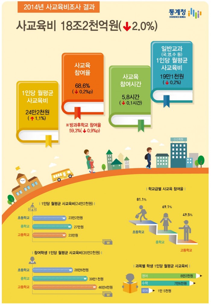 26일 통계청에 따르면 지난해 초중고 사교육비는 월평균 24만2000원인 것으로 집계됐다.