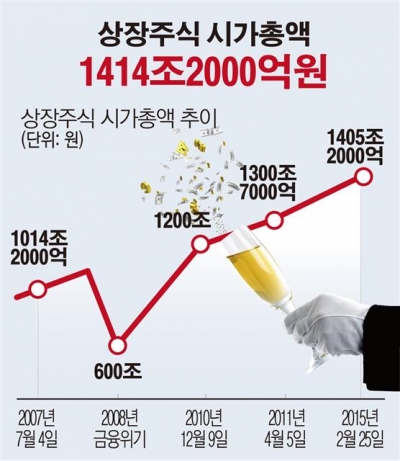 증시 시가총액은 지난 2007년 7월 4일(1014조2000억원) 처음으로 1000조원 시대를 연 이래 2008년 금융위기 이후에는 600조원 선이 무너지기도 했다.