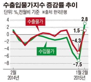 한국은행이 13일 발표한 ‘수출입물가지수’ 자료에 따르면 지난달 원화 기준 수입물가지수(2010년 100 기준)는 82.28로 한 달 전보다 2.8% 상승했다. 이는 1년 만에 오름세로 전환된 것이며 2011년 2월(2.8%) 이후 4년 만에 가장 큰 폭으로 올랐다.
