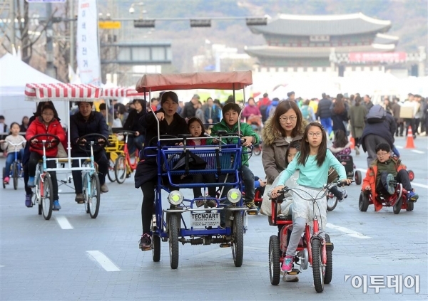 올해 첫 세종대로 보행전용거리 행사가 열린 15일 서울 광화문 광장 세종대로 한쪽 차선에 차량의 통행이 제한됐다. 광화문 광장을 찾은 시민들이 자전거를 타며 휴일을 즐기고 있다. 노진환 기자 myfixer@