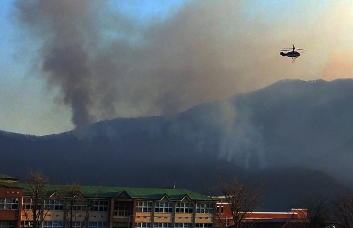 화천군 간동면 도송리에서 발생한 불이 이틀째 계속되고 있는 가운데 23일 오전 헬기가 마을 상공을 오가며 진화작업을 하고 있다. 이번 산불로 산림 3㏊가 소실된 것으로 잠정 파악됐다.