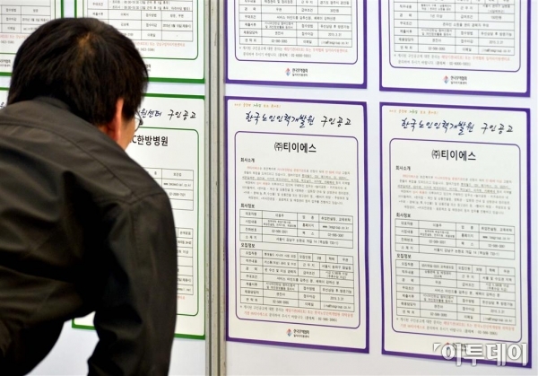 한 구직자가 23일 삼성동 코엑스에서 열린 ‘2015 중장년 재취업 토크콘서트’에 참석해 채용게시판을 살펴보고 있다. 무역협회가 개최한 이번 행사는 재취업을 희망하는 중장년 구직자 400여명을 대상으로 취업에 필요한 정보제공과 구직 애로사항을 돕기 위해 마련됐다. 신태현 기자 holjjak@