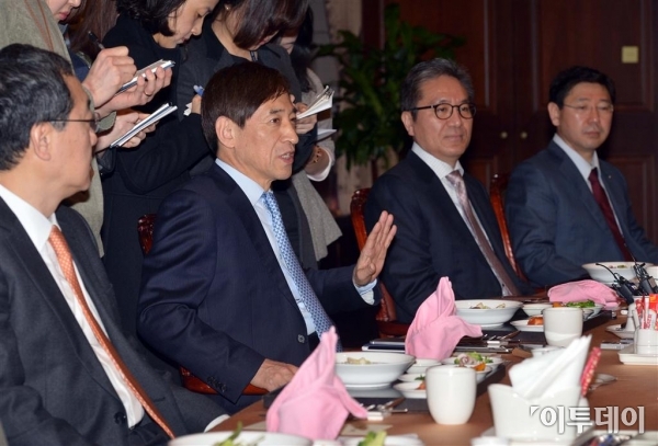 이주열 한국은행 총재가 24일 서울 남대문로 한국은행에서 열린 경제동향간담회에 참석해 모두발언하고 있다. 이날 이 총재는 “한국경제가 기조적으로 개선될 것으로 예상한다”고 말했다. 신태현 기자 holjjak@