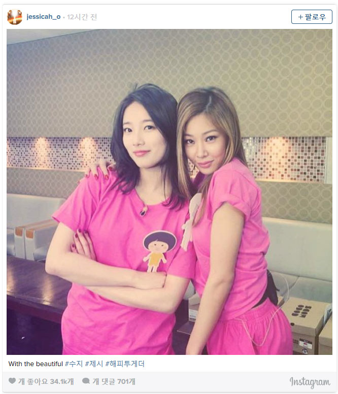 미쓰에이 수지와 언프리티랩스타에 출연 중인 제시가 편안한 찜질방 가운을 입고 함께 포즈를 취한 사진이 공개돼 화제다. 제시는 인스타그램에 'With the beautiful' 이라는 글과 함께 수지와 찍은 사진을 29일 올렸다. 수지와 제시는 매우 친근한 포즈를 취하고 있다.