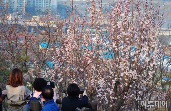 포근한 주말날씨를 보인 29일 서울 응봉동 응봉산에서 꽃망울을 터뜨린 벚꽃이 봄의 시작을 알리고 있다. 신태현 기자 holjjak@