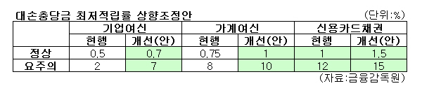 또 가계자금대출도 각각 0.25%Pㆍ2%P 높아진 1%ㆍ10%, 신용카드채권도 각각 0.5%Pㆍ3%P 상향된 1.5%ㆍ15%의 대손충당금을 쌓아야 한다.