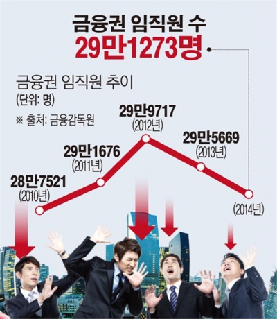 특히 증권과 생명보험에서 가장 큰 감소폭을 보였다. 증권사 임직원 수는 2011년 4만4055명을 기록한 이후 3년간 총 7494명 줄었고, 생보사 임직원 수는 지난해 2만8111명을 기록해 전년보다 2269명(7.5%) 감소했다.
