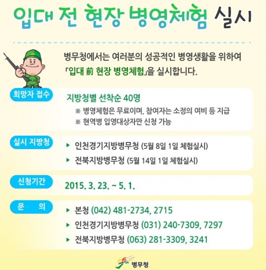 병무청 "입대전 현장 병영체험 해보세요" 선착순 모집