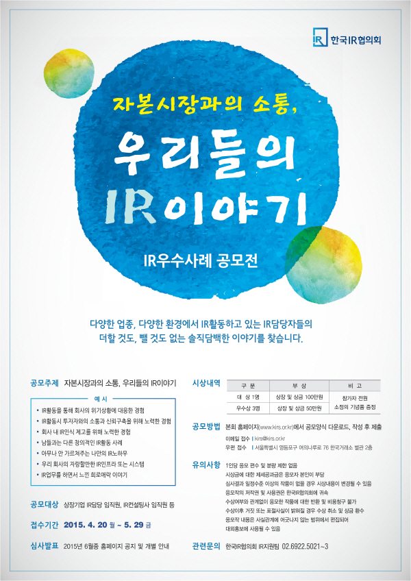 ‘자본시장과의 소통, 우리들의 IR이야기’를 주제로 하는 이번 공모전은 기업의 IR담당자들이 IR활동을 하면서 겪은 특별한 경험과 IR이야기를 함께 공유하기 위해 마련됐다. 이를 통해 IR에 대한 관심을 높이고 자본시장의 건전한 발전에 기여한다는 취지다.