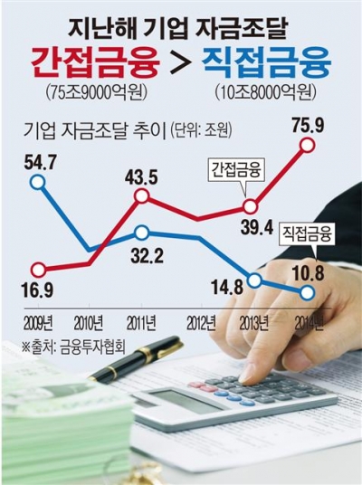 30일 금융투자협회에 따르면 지난해의 경우 직ㆍ간접금융의 자금조달 규모 격차가 더욱 벌어져 직접금융이 10조8000억원으로 간접금융(75조9000억원)의 약 7분의 1 수준에 머물렀다.