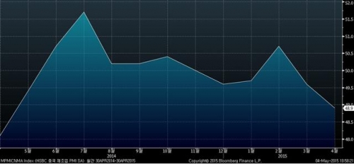 이는 지난달 말 발표했던 예비치 49.2에서 하락하고 블룸버그 집계 전문가 예상치 49.4를 밑돈 것이다. 또 PMI는 지난해 4월 이후 1년 만에 최저치를 기록했으며 기준인 50을 2개월 연속 밑돌아 경기위축을 나타냈다.