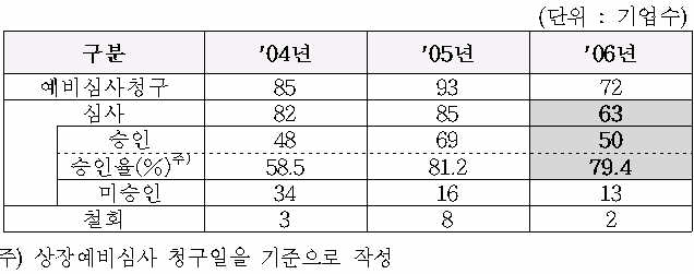 2005년 1월 KRX 출범이후 현재까지 2년간 총 165개사가 코스닥시장 상장예비심사를 청구했다. 이중 148개 기업을 심사해 119개 기업을 승인(승인율 80.4%)했으며, 현재 7개사에 대한 심사가 진행중이다.
