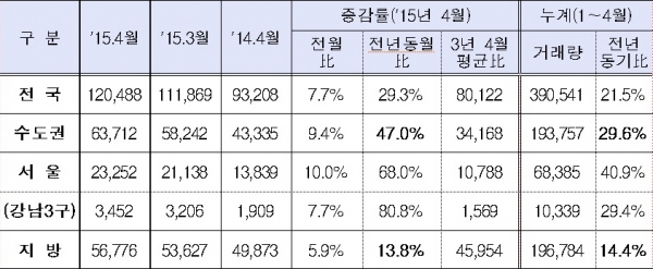 4월 지역별 거래량은 전년동월대비 수도권은 47.0% 늘었고 지방은 13.8% 증가해 수도권이 상대적으로 크게 증가했다.