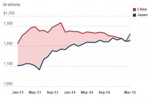 중국이 지난 3월 일본을 제치고 다시 미국 국채 최대 보유국 지위에 올랐다고 15일(현지시간) 월스트리트저널(WSJ)이 보도했다.