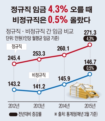 28일 통계청이 발표한 ‘2015년 경제활동인구조사 근로형태별 부가조사 결과’에 따르면 올 1~3월 비정규직의 월평균 임금은 146만7000원으로 지난해 같은 기간 145만9000원보다 0.5%(8000원) 늘어나는 데 그쳤습니다.
