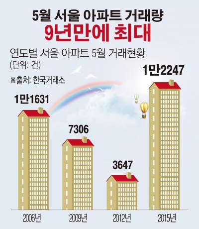 5월 서울 아파트 거래가 9년 만에 최대치를 기록했습니다. 1일 서울부동산정보광장에 따르면 지난달 서울 아파트 거래량은 1만2247건으로 실거래가 조사를 시작한 2006년 이후 5월 중 최고 기록을 세웠습니다.