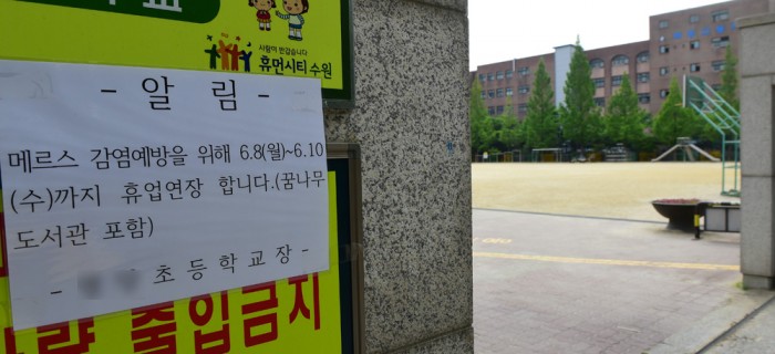 중동호흡기증후군(MERS·메르스) 확산을 막기위해 경기 수원, 화성, 평택 등 7개 지역 학교에 12일까지 휴업명령이 내려진 가운데 8일 오전 경기 수원의 한 학교에 휴업을 알리는 게시물이 부착돼 있다.