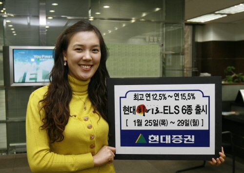 현대증권은 오는 25일부터 29일까지 원금보장형, 1Stock형 및 2Stock형 ELS상품 총 6종을 공모한다고 24일 밝혔다. 청약금액은 최저100만원부터 100만원 단위로 가입할 수 있다.