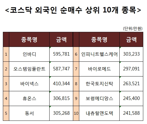 25일 코스닥 외국인 순매수 상위 10개 종목