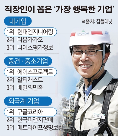 직장인이 뽑은 ‘가장 행복한 기업’으로 대기업 중에선 현대엔지니어링이, 중견·중소기업 중에서는 게임업체인 에이스프로젝트가 선정됐습니다. 소셜미디어 잡플래닛이 지난해 11월부터 올해 5월까지 직장인이 작성한 기업 리뷰 2만2000여 건을 바탕으로 분석한 기업 문화 리포트를 30일 발표했습니다.