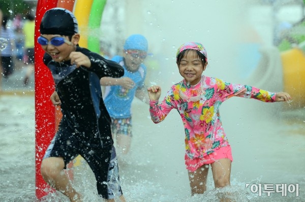 서울 노원구가 지역 주민들을 위한 가족 놀이 및 휴식 공간을 제공하기 위해 상계동 770-6 일대 중랑천 녹천교 앞 ‘중랑천워터파크’ 4일부터 개장했다.중랑천워터파크는 전체면적 3,375㎡로 390㎡ 규모의 성인풀 1개와 356㎡의 물놀이장 1개 외에도 의무실, 탈의실, 샤워장, 매점, 화장실, 멀티파라솔 등의 편의시설을 갖췄다. 다음달 23일까지 운영되며, 매주 월요일은 휴무. 5일 오후 중랑천워터파크를 찾은 어린이들이 물놀이를 하며 더위를 식히고 있다. 노진환 기자 myfixer@