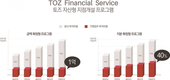 금액 확정형은 표준 지점 개설 금액 중 1억원만 투자하면 토즈 스터디센터를 개설할 수 있는 프로그램으로, 투자한 금액에 해당되는 비율에 따라 수익이 분배된다. 지분 확정형 프로그램은 표준 지점 개설 금액의 40%를 투자하면 전체 수익의 50%의 수익을 확보할 수 있다.