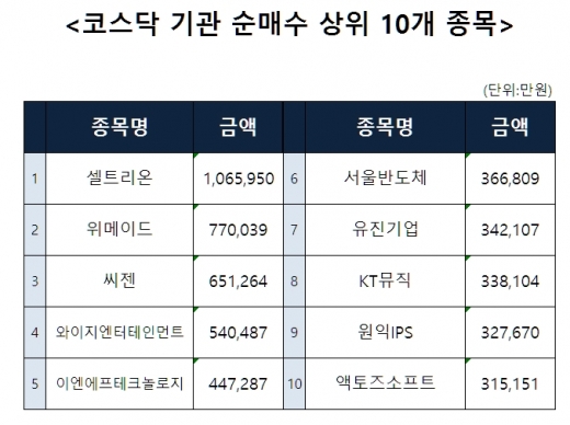 [코스닥 기관 순매수 상위 10개 종목]