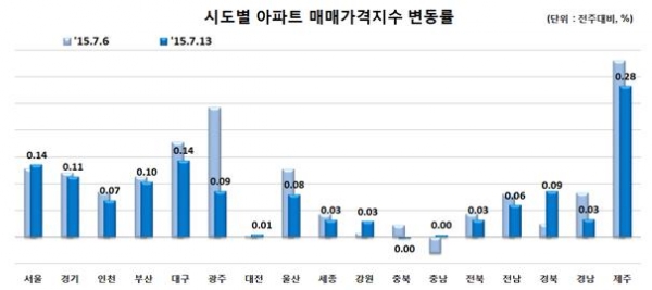 시도별로는 제주(0.24%), 서울(0.17%), 광주(0.15%), 경기(0.14%), 인천(0.14%), 대구(0.11%), 전북(0.09%), 경북(0.09%), 울산(0.08%)등은 올랐고 충북(-0.04%)은 떨어졌다.