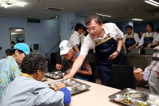 ▲곽범국 예금보험공사 사장(가운데)이 21일 서울 은평구 나눔의 둥지에서 인근 지역 무의탁 어르신들에게 무료 급식을 제공하고 있다.(사진 = 예금보험공사 제공)