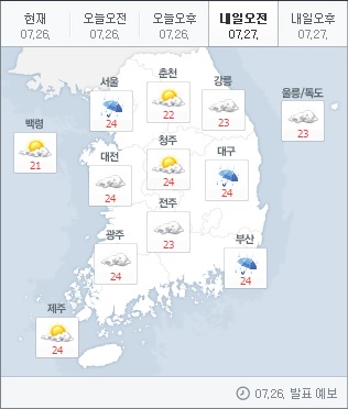 내일(27일)은 장마전선의 영향으로 흐리고 비가 내릴 전망이다. 남부지방은 태풍의 영향에서 점차 벗어나겠다.