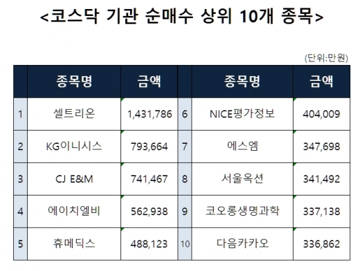 [코스닥 기관 순매수 상위 10개 종목]