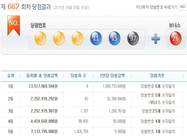 8일 제662회 나눔로또, 로또복권을 추첨한 결과 1등 당첨번호는 '5, 6, 9, 11, 15, 37'의 6개다. 2등 보너스번호는 '26'이다.