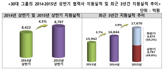 경영환경 악화에도 불구하고 올해 상반기 30대 그룹의 협력사 동반성장 지원금액이 지난해보다 늘어난 것으로 조사됐다.