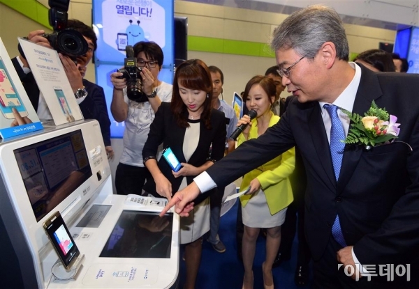 임종룡 금융위원장이 31일 서울 삼성동 코엑스에서 열린 ‘제2회 대한민국 금융대전’에 참석해 우리삼성페이 이용가능ATM을 살펴보고 있다. 프리미엄 경제신문 이투데이가 주최한 이번 박람회에선 17개 은행, 정책금융기관, 벤처캐피탈 등 전 금융회사가 참여해 투자처를 마련하지 못해 창업을 미루고 있는 예비창업자와 우수하고 참신한 기술력과 노하우를 지니고 있지만 자금조달에 어려움을 겪어온 중소기업에 금융지원 활로를 제공한다. 신태현 기자 holjjak@