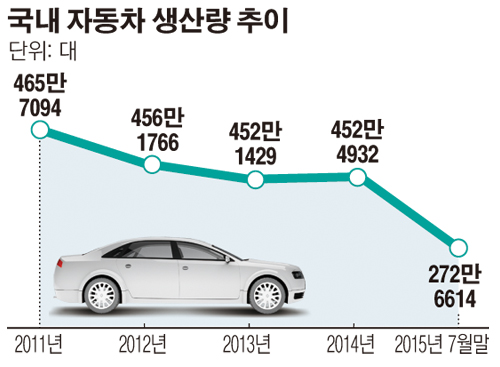 한국자동차산업협회(KAMA)에 따르면 국내 자동차 생산량은 2011년 465만 7094대를 정점으로 지난해(452만4932대)를 기록하는 등 지속적으로 하락하고 있다.