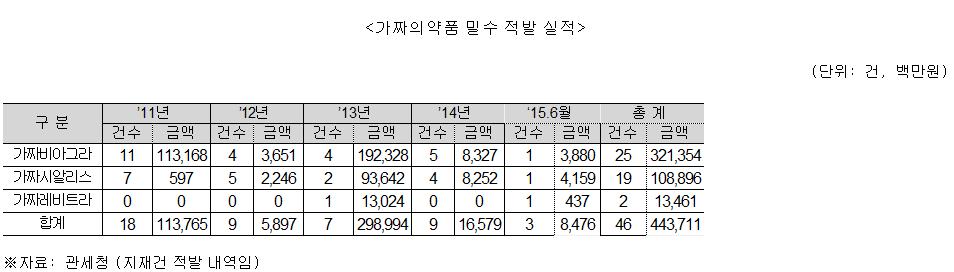 5일 이종배 의원(새누리당, 충북 충주)이 관세청으로부터 받은 ‘가짜의약품 밀수 적발 현황’에 따르면, 최근 5년간 가짜의약품 밀수 적발금액이 총 4,437억원에 달했다. 연도별로는 2011년 1,137억 6,500만원, 2012년 58억 9,700만원, 2013년 2,989억 9,400만원, 2014년 165억 7,900만원, 2015년 6월까지 84억7,600만원이다.