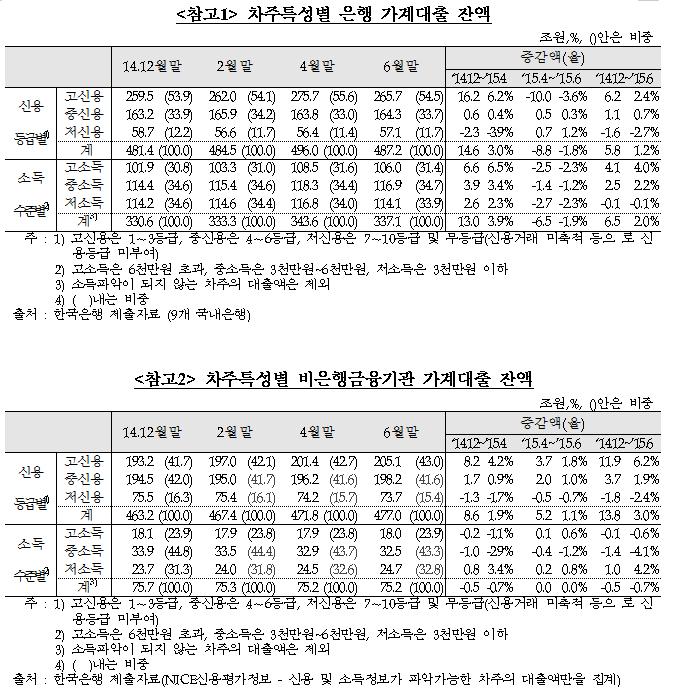 최근 6개월 동안 소득별로 보았을 때 소득 6000만원 이하 중․저소득 가계의 은행대출은 2조4000억원 증가하였고, 소득 3천만원 이하 저소득 가계의 비은행금융기관 대출은 1조원 증가하는 것으로 나타나 중저소득 가계의 가계대출 규모가 증가하는 추세이다. 같은 기간 동안 신용등급 7~10등급 가계대출은 은행의 경우 1.6조원, 비은행금융기관의 경우 1.8조원 감소하나 4~6등급 가계대출이 은행은 1조1000억원, 비은행금융기관은 3조7000억원 늘어 중신용 가계대출 규모가 증가하는 것으로 나타났다.