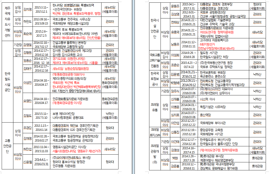 한국철도시설공단의 경우 세월호 사건 이틀 후 업무연관성이 없는데도 불구하고 ‘국회의원 박근혜 특보, 한나라당 대선경선 박근혜후보! 동북부부단장’이었던 공동묘지 대표이사와 이사장을 한 날 한 시에 비상임 이사로 임명했으며 한국철도시설공단은 현재 전체 비상임 이사 7명중 5명이나 낙하산인사로 채워져 있다.