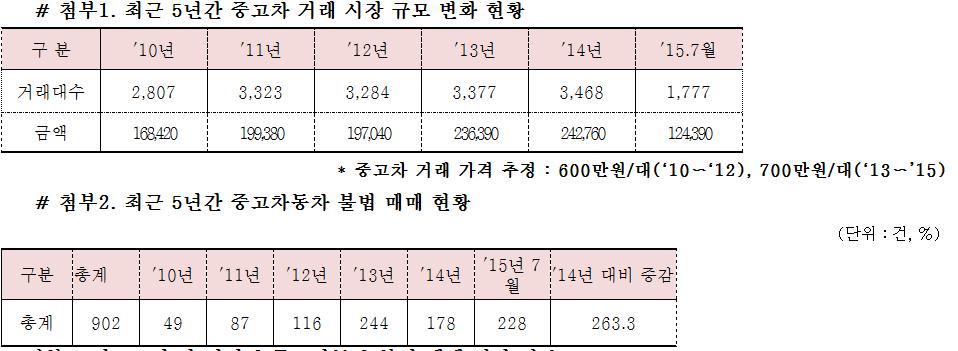 7일 국회 국토교통위원회 소속 황영철 의원(새누리당, 강원도 홍천·횡성)이 국토교통부로부터 제출받은 2015년 7월 기준으로 최근 5년간 발생한 중고자동차 불법 매매 적발 현황 자료를 분석한 결과, 총 902건의 중고차 불법 매매가 적발되었고 2010년에 49건 대비 2014년에는 178건으로 263.3% 증가한 것으로 나타났다. 2015년에는 7월까지 228건이 발생해 작년보다도 50건이나 늘어났다.