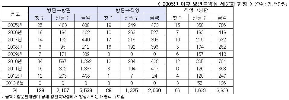 이 기간 동안 방문판매원들의 월평균 매출은 82억원으로 연간 984억원에 달했는데, 방판점은 졸지에 월평균 57억원, 연간 688억원의 피해를 입은 사실이 중소기업청 조사결과 드러났다.