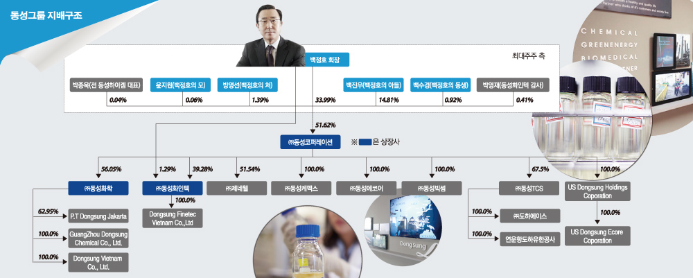 동성코퍼레이션은 동성화학 지분 56.05%를, 동성화인텍 지분 39.28%를 보유하고 있다. 백 회장은 동성화인텍 지분도 갖고 있는데, 지분율은 1.29%다. 또 동성코퍼레이션은 동성케멕스·동성에코어·동성빅썸 등을 100% 자회사로 두고 있으며, 제네웰 지분 51.54%를, 동성TCS 지분 67.50%를 보유 중이다. 동성TCS는 도하에이스를 100% 자회사로 두고 있으며, 이 회사는 동성코퍼레이션의 손자회사이기도 하다.