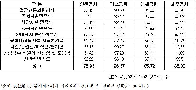 8일 변재일의원(새정치민주연합, 청주시)은 국토교통부가 제출한 ‘2014 항공교통서비스평가’결과 국내 대형 국제공항인 인천, 김포, 김해, 제주 공항 중 인천공항의이용자 만족도 점수가 76.93점(평균점수)으로 4개 공항중 최하위라고 밝혔다.